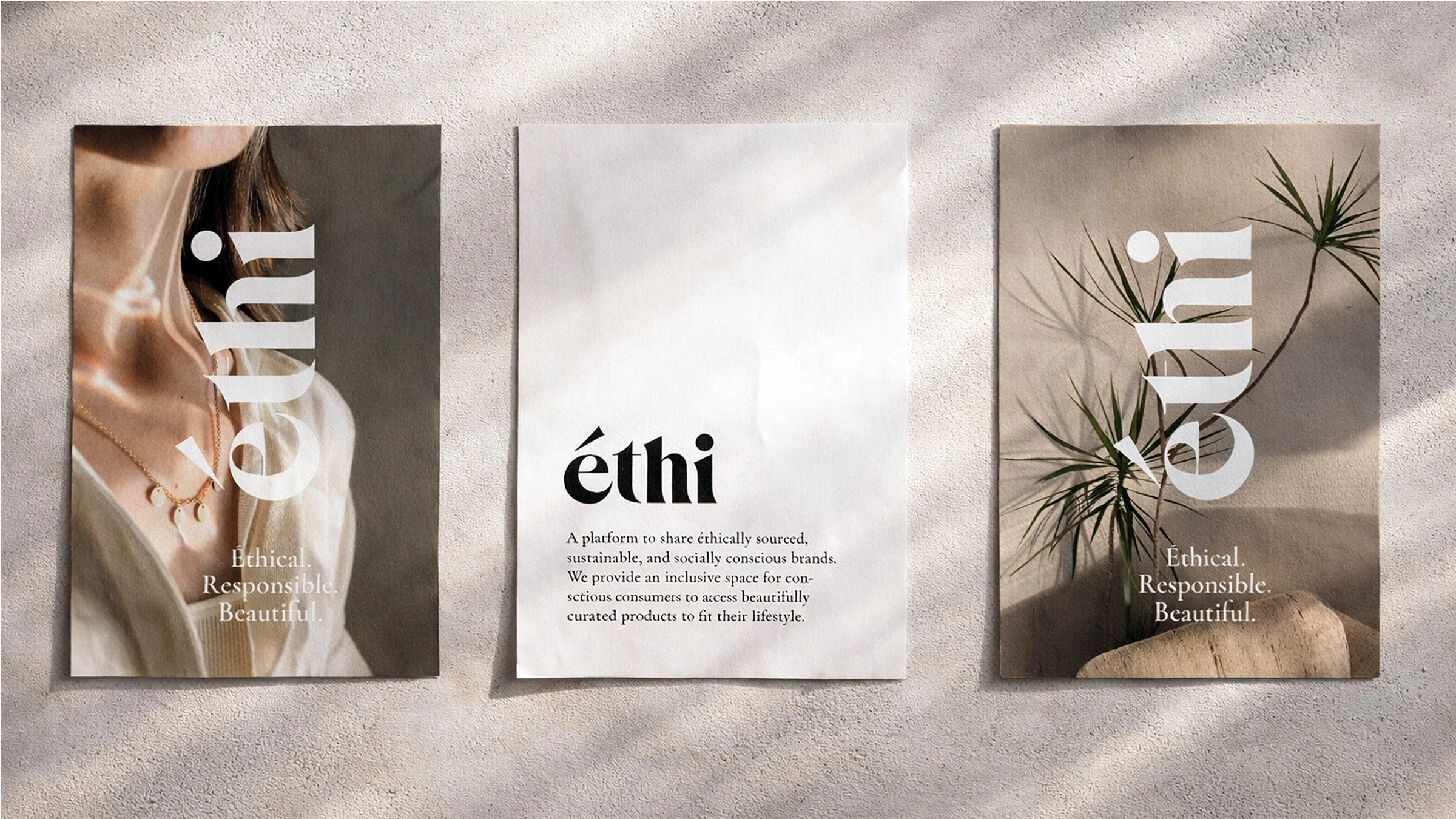 Through collaboration with Éthi, we created a brand identity that embodies their inclusivity and social consciousness ethos. Our design approach focused on elegance and understatement, with a warm earthy color palette evoking sustainable living. Our custom wordmark is refined with subtle contrast, creating a clean, modern, and sophisticated yet approachable aesthetic. The branding effort reflects Éthi's mission to provide a platform for ethically sourced, sustainable, and socially conscious brands, appealing to quality-conscious, curated lifestyle consumers.
