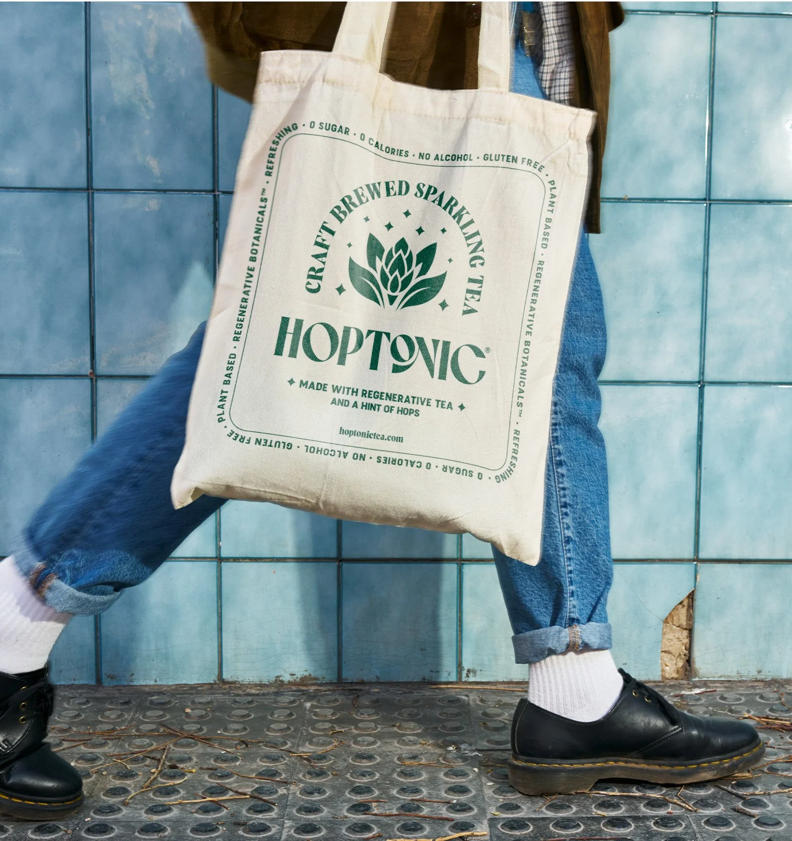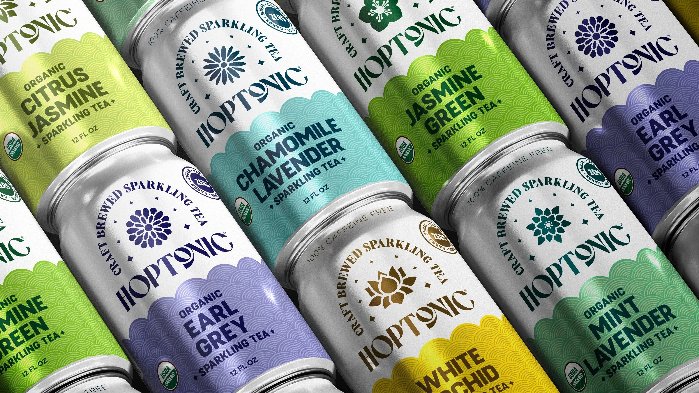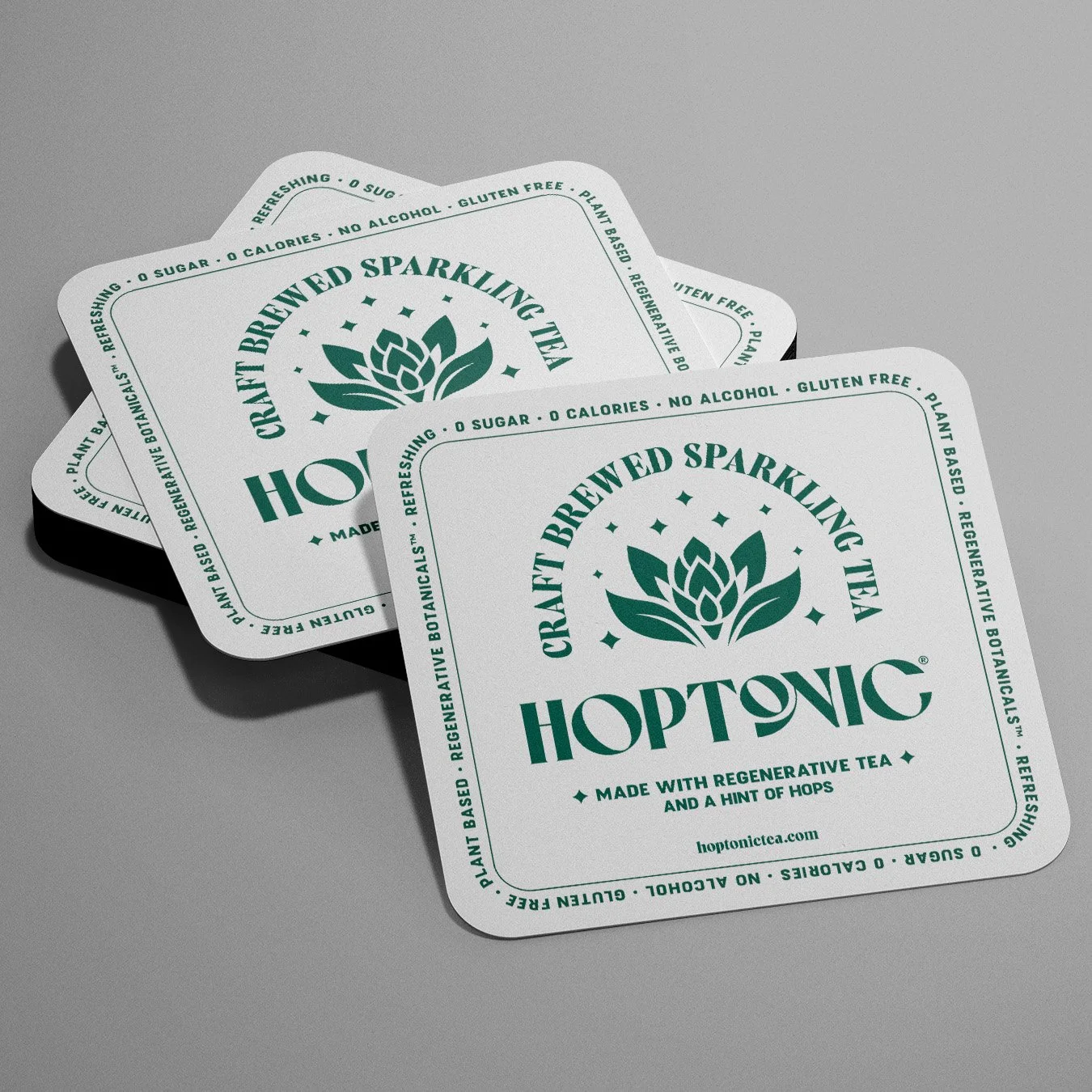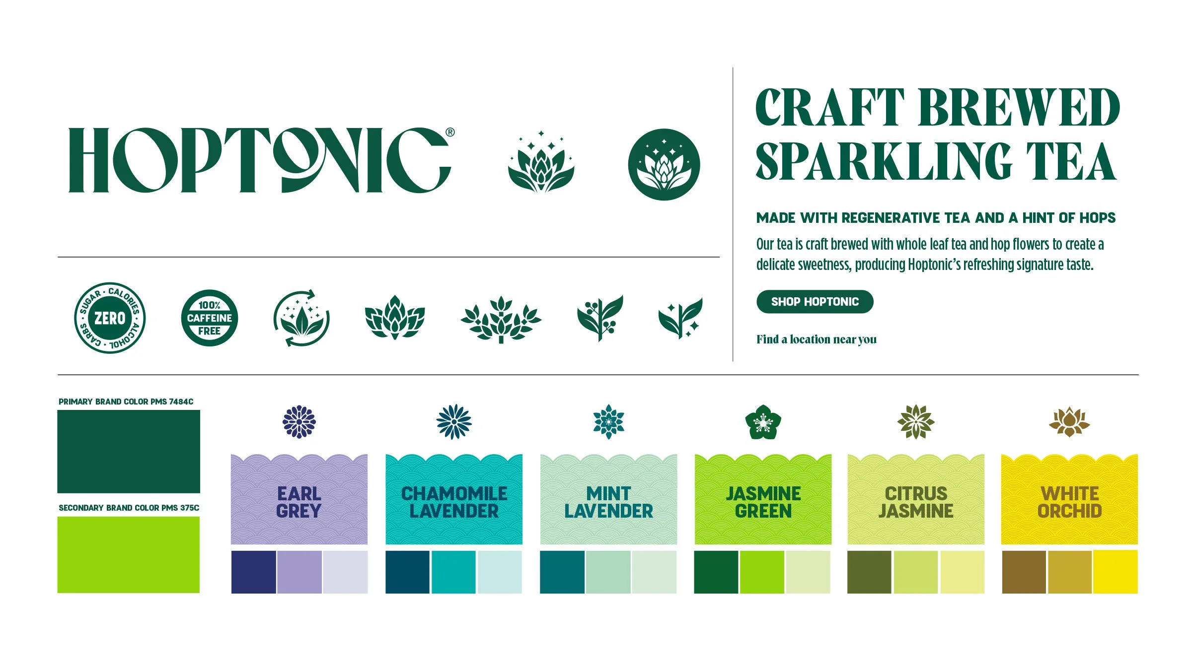 Hoptonic is an innovative brand offering a unique beverage experience: craft brewed sparkling tea with delicate hints of hops. This refreshing blend bridges traditional teas and modern craft beverages. Our custom wordmark reflects Hoptonic’s elegance and modernity, while the brand icon embodies the essence of Hoptonic. Featuring blooming tea leaves wrapping around a hoppy bud with effervescent sparkles, the icon symbolizes the harmonious blend of our botanical ingredients.