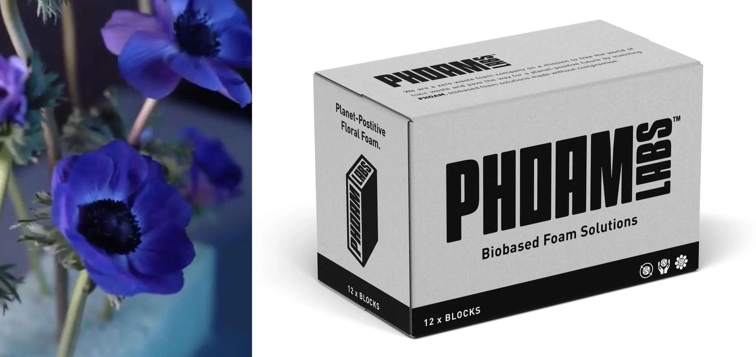 PHOAM LABS™ is a zero-waste foam company on a mission to build a sustainable future with PHOAM™, a bio-based solution made without compromise. We collaborated with founder Dundee Butcher and her team to refresh the brand and develop an identity that embodies their commitment to sustainability. The wordmark draws inspiration from the block-shaped PHOAM products, with custom letterforms reflecting the foam’s pliability. Its minimalist, technical design stands out in the floral industry, emphasizing the company’s innovative approach to creating sustainable products.